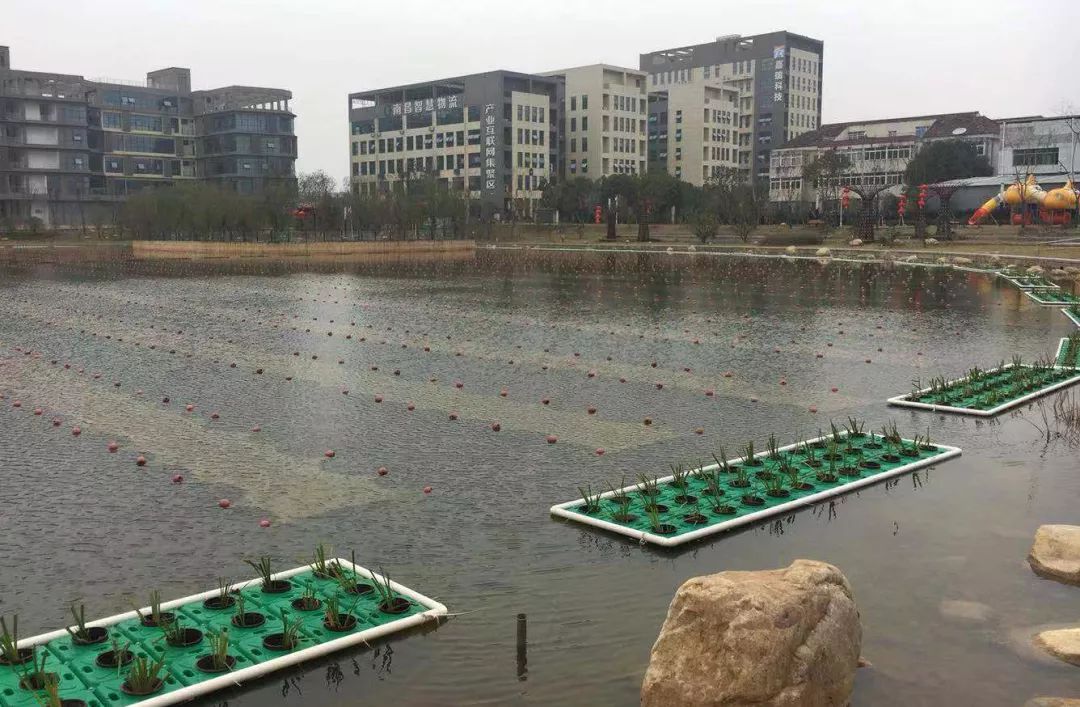 由于湖中生物缺失,種植了總面積為500平方米的植物,選擇了冬季耐寒的水生植物——菖蒲(長方形,共456平方米)、金魚藻(圓形浮島,共44平方米),來加強氨氮和總磷的降解,從而恢復(fù)整個湖體的生態(tài)系統(tǒng)。LGe新型光催化網(wǎng)_水庫治理_河道治理_水生態(tài)修復(fù)_水環(huán)境治理與修復(fù)_江蘇雙良環(huán)境科技有限公司