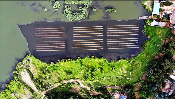 同年4月,云南省大理州洱源縣西湖新型光催化技術(shù)水質(zhì)提升示范研究項目開始進入全面施工階段。首先,采用柔性圍隔分離出11500㎡的水域,減少內(nèi)外水體交換。在水下約十公分處敷設(shè)水域占比面積為31.7%的光催化網(wǎng),它是一種將多種納米級光催化材料和石墨烯強化材料相結(jié)合的新型光催化材料,負載于具有超高比表面積的PP纖維絲的新型水環(huán)境生態(tài)治理設(shè)備,與水體充分接觸,能高效吸收太陽光,利用光催化氧化作用無選擇降解水中有機污染物,提升水體透明度,改善水體生境,引導水生態(tài)自組織修復(fù),抑制藍藻水華發(fā)生。隨著水中微生物、底棲動物、浮游藻類、沉水植物以及魚類的逐步恢復(fù),水生態(tài)系統(tǒng)區(qū)域健全,從而進一步使水質(zhì)得到提升,最終形成水生態(tài)-水質(zhì)提升的良性循環(huán)體系。用時1個月,項目全面竣工并正式開始后期運營維護工作,確保治理水體生態(tài)系統(tǒng)運行良好,水質(zhì)持續(xù)保持并提升。Elg新型光催化網(wǎng)_水庫治理_河道治理_水生態(tài)修復(fù)_水環(huán)境治理與修復(fù)_江蘇雙良環(huán)境科技有限公司