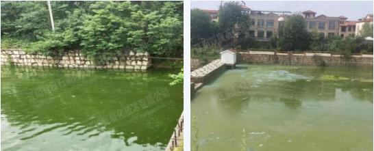 治理前水體發(fā)綠,水體富營養(yǎng)化嚴(yán)重。wtU新型光催化網(wǎng)_水庫治理_河道治理_水生態(tài)修復(fù)_水環(huán)境治理與修復(fù)_江蘇雙良環(huán)境科技有限公司