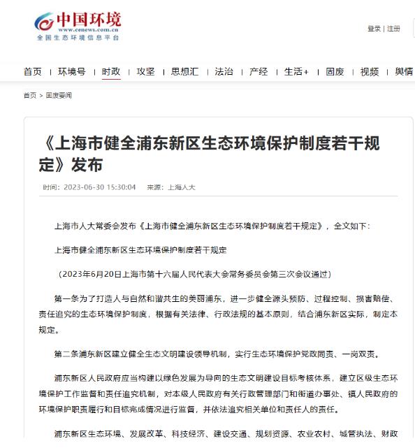 《上海市健全浦東新區(qū)生態(tài)環(huán)境保護(hù)制度若干規(guī)定》于2023年6月20日經(jīng)市十六屆人大常委會(huì)第三次會(huì)議表決通過(guò),將于2023年8月15日起施行。