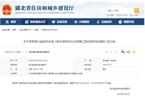 現(xiàn)批準(zhǔn)《城市湖泊水生態(tài)修復(fù)工程成效評(píng)估規(guī)程》為湖北省地方標(biāo)準(zhǔn),編號(hào)DB42/T2044-2023,自 2023年8月27日實(shí)施。