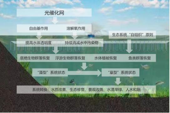 技術(shù)原理:在一定光照條件下,通過光生載流子遷移,發(fā)生氧化還原反應(yīng),削減水體中的營養(yǎng)物質(zhì),提升了水環(huán)境的理化和生物反應(yīng)速率。同時,依據(jù)生態(tài)系統(tǒng)的自組織原則,打破原系統(tǒng)的平衡,促進水生態(tài)系統(tǒng)健康發(fā)展。在“科技與自然共力修復(fù)”的作用下,加速系統(tǒng)轉(zhuǎn)換,迅速實現(xiàn)水生系統(tǒng)“草型清水穩(wěn)態(tài)”,使其持續(xù)健康發(fā)展,形成具有強效自凈能力的健康自然生態(tài)環(huán)境。nzq新型光催化網(wǎng)_水庫治理_河道治理_水生態(tài)修復(fù)_水環(huán)境治理與修復(fù)_江蘇雙良環(huán)境科技有限公司