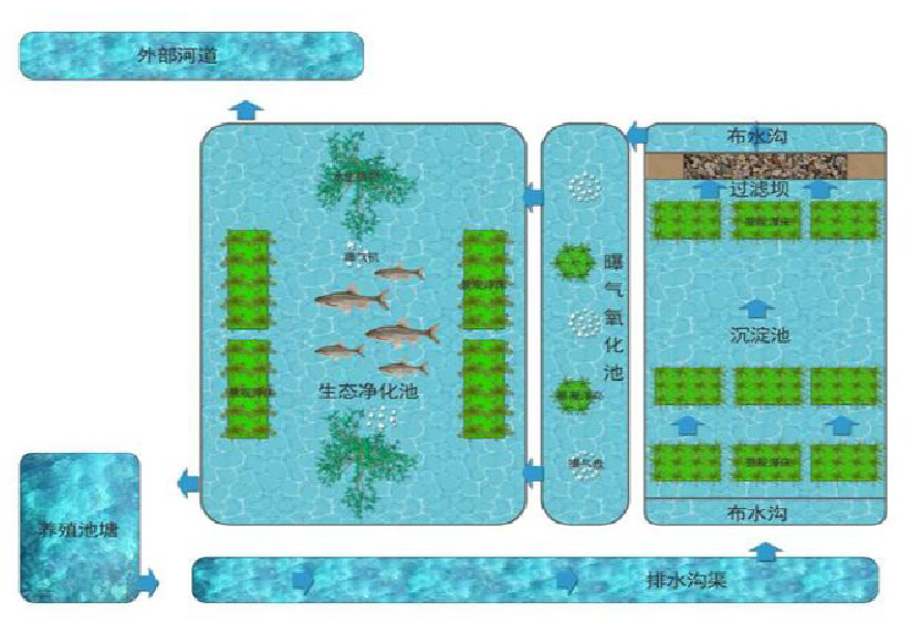 根據(jù)養(yǎng)殖池塘規(guī)模和地理環(huán)境條件,結(jié)合沙洋項(xiàng)目區(qū)水產(chǎn)養(yǎng)殖尾水的特點(diǎn)和實(shí)際養(yǎng)殖情況,綜合選用“生態(tài)溝渠、塘表濕地、三池兩壩、魚菜共生”等多種形式、多級(jí)生態(tài)凈化的養(yǎng)殖尾水治理模式,實(shí)現(xiàn)養(yǎng)殖尾水達(dá)標(biāo)排放和資源化利用。