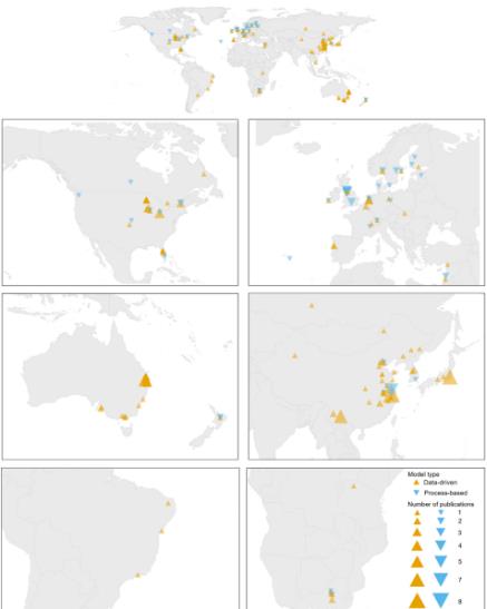 PB或DD的使用是隨著時間的推移而改變的。在2013年之后,DD模型的比例有所增加(圖2)。在澳大利亞、美國和日本,DD預(yù)報模型應(yīng)用的比例很高,而PB方法在英國和北歐國家更常見(圖3)。dLN新型光催化網(wǎng)_水庫治理_河道治理_水生態(tài)修復(fù)_水環(huán)境治理與修復(fù)_江蘇雙良環(huán)境科技有限公司