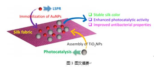 2NPs) 的復(fù)合涂層來(lái)增強(qiáng)絲織物的功能。通過(guò)原位合成將金納米粒子涂覆在絲織物上,然后在聚乙烯亞胺(PEI)的幫助下負(fù)載二氧化鈦納米粒子。 AuNPs通過(guò)其局部表面等離子體共振(LSPR)使真絲織物具有鮮艷的色彩,這種共振在TiO