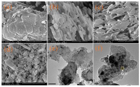 圖2.(a)Ag2O/ B-g- C3N4,(b)Ag2O/ g- C3N4納米管,(c)Ag2O/ g- C3N4納米片,(d)Ag2O/ H-g- C3N4的SEM圖, 14.3 wt%Ag2O/ B-g- C3N4的(e)TEM圖和(f)HRTEM圖像。vx4新型光催化網(wǎng)_水庫治理_河道治理_水生態(tài)修復(fù)_水環(huán)境治理與修復(fù)_江蘇雙良環(huán)境科技有限公司