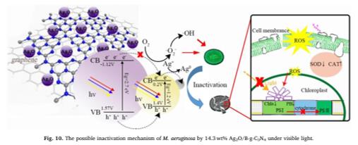 圖10.在可見光下14.3 wt%的Ag2O/g-C3N4致銅綠微囊藻失活的假設(shè)機(jī)理vx4新型光催化網(wǎng)_水庫治理_河道治理_水生態(tài)修復(fù)_水環(huán)境治理與修復(fù)_江蘇雙良環(huán)境科技有限公司