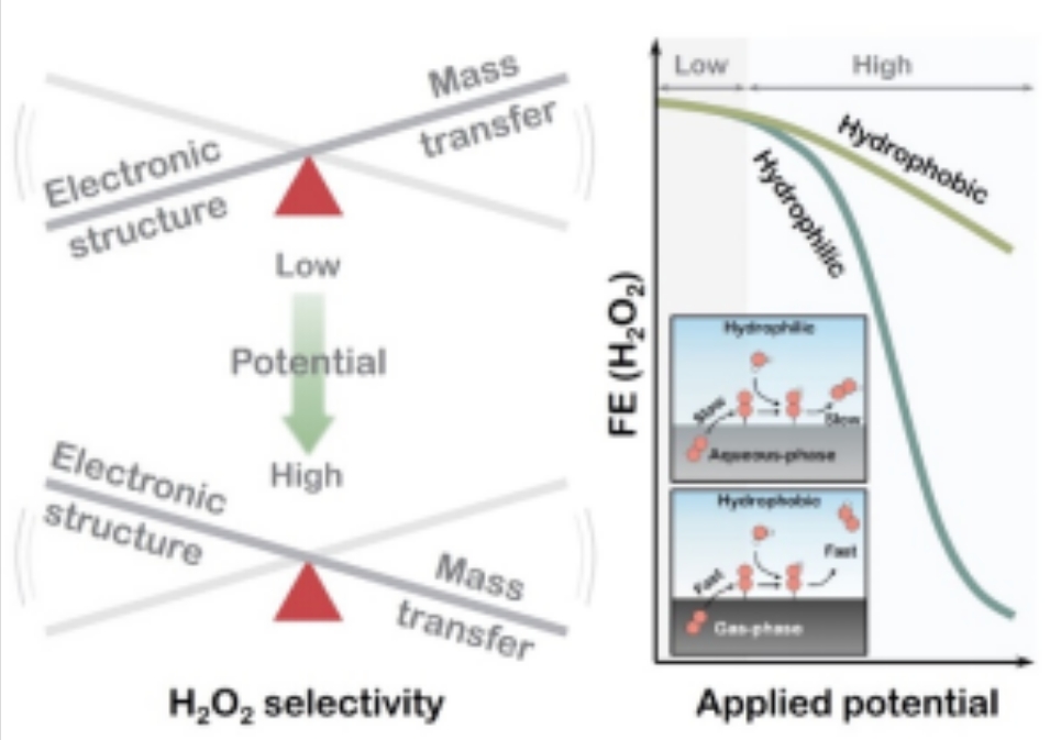 H2O2電合成工藝近年來(lái)取得了長(zhǎng)足的進(jìn)步,一般認(rèn)為阻礙該技術(shù)工業(yè)化實(shí)施的關(guān)鍵瓶頸在于2e− ORR的耗氣特性與O2在水中固有的低溶解度間難以調(diào)和的矛盾。氣體擴(kuò)散電極(GDE)允許直接利用氣態(tài)原料并大大縮短氣體遞送距離被廣泛認(rèn)為是最適合2e− ORR的電極架構(gòu)平臺(tái)。特別是對(duì)于那些具有仿生呼吸設(shè)計(jì)的GDE,其無(wú)需耗能的曝氣設(shè)施的特點(diǎn)為進(jìn)一步推進(jìn)商業(yè)上可行的電解電堆鋪平了道路。因此,設(shè)計(jì)篩選先進(jìn)電催化劑將ORR選擇性引導(dǎo)至所需的2e−路徑,隨后將其集成至GDE用于體相電解已成為H2O2電合成領(lǐng)域一個(gè)突出的研究范式。然而始終令人困惑的是,電催化劑和組裝的GDE在體相電解過(guò)程中經(jīng)常表現(xiàn)出H2O2選擇性的巨大差異,這對(duì)電極材料的系統(tǒng)設(shè)計(jì)帶來(lái)了重大挑戰(zhàn)。該研究闡明了除電催化劑本征特性之外的關(guān)鍵物種(包括反應(yīng)物和產(chǎn)物)的傳質(zhì)行為在決定電極尺度H2O2選擇性方面的關(guān)鍵作用。這種規(guī)律在高反應(yīng)速率(電流密度)條件下由于傳輸限制的加劇將變的更加顯著。研究人員利用GDE的擴(kuò)散相關(guān)參數(shù)(即潤(rùn)濕性和催化劑層厚度)作為探針因素,結(jié)合短期和長(zhǎng)期電解以及原位電化學(xué)反射吸收成像和理論計(jì)算,系統(tǒng)研究了傳質(zhì)與傳質(zhì)行為控制的局部微環(huán)境對(duì)O2和H2O2輸運(yùn)的影響。相應(yīng)地揭示了電極尺度上擴(kuò)散控制的轉(zhuǎn)化選擇性的機(jī)制起源。該研究強(qiáng)調(diào)了對(duì)主流疏水GDE進(jìn)行能夠同步優(yōu)化反應(yīng)物和產(chǎn)物的傳質(zhì)行為的架構(gòu)創(chuàng)新的必要性,為面向電合成的下一代GDE的研發(fā)指引了方向。