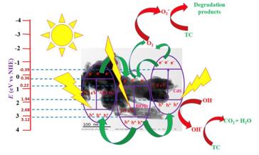 光催化降解被認為是去除廢水中抗生素藥物污染物的最有效的方式。本研究采用水熱法和沉淀法合成了ABC(Ag2CO3/BiOBr/CdS)復合光催化劑。ABC復合材料用于研究四環(huán)素(TC)在可見光照射下的降解活性。物理化學表征方法(例如掃描電子顯微鏡(SEM)、透射電子顯微鏡(TEM)、高分辨率透射電子顯微鏡(HR-TEM)、紫外-可見光譜(UV),光致發(fā)光(PL)和時間分辨光致發(fā)光(TRPL)清楚地表明,該復合材料已成功構(gòu)建,能夠增強加寬的可見光吸收,誘導電荷轉(zhuǎn)移和電子-空穴對的分離效率。通過在水介質(zhì)中光降解四環(huán)素來檢測所有樣品的光催化活性。ABC催化劑的光催化降解率在70min內(nèi)可去除98.79%的TC,分別是Ag2CO3的1.5倍、BiOBr的1.28倍和BC催化劑的1.1倍。還研究了TC濃度、催化劑用量和初始pH值等操作參數(shù)對TC降解活性的影響。淬滅實驗及電子順磁共振(EPR)實驗表明,在光催化過程中OH和O2·−起著關(guān)鍵作用。此外,由于其組分之間的協(xié)同作用,催化劑在可重復使用性和穩(wěn)定性測試中表現(xiàn)出良好的性能。在詳細分析的基礎(chǔ)上,提出了ABC復合材料中TC的降解機理。本研究將提供一種高效且可回收的光催化劑,用于去除抗生素水污染物。scg新型光催化網(wǎng)_水庫治理_河道治理_水生態(tài)修復_水環(huán)境治理與修復_江蘇雙良環(huán)境科技有限公司
