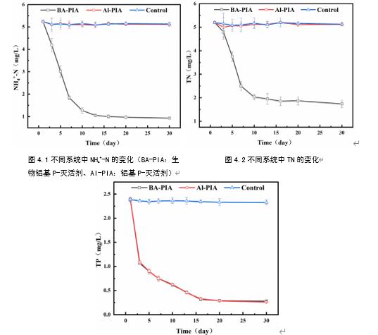 圖4.1不同系統(tǒng)中NH4+-N的變化(BA-PIA:生物鋁基P-滅活劑、Al-PIA:鋁基P-滅活劑)scg新型光催化網(wǎng)_水庫治理_河道治理_水生態(tài)修復_水環(huán)境治理與修復_江蘇雙良環(huán)境科技有限公司